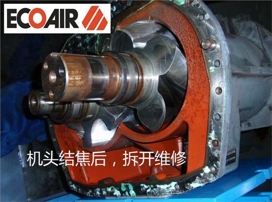 (2)機頭內油結焦是螺桿式空壓機在油品較差或溫度較高的情況經常出現的現象,由于機頭結焦,摩擦阻力增大,機組的負荷增大,電流增大。嚴重時螺桿與轉子被油焦粘合在一起,機組無法自由轉動。
